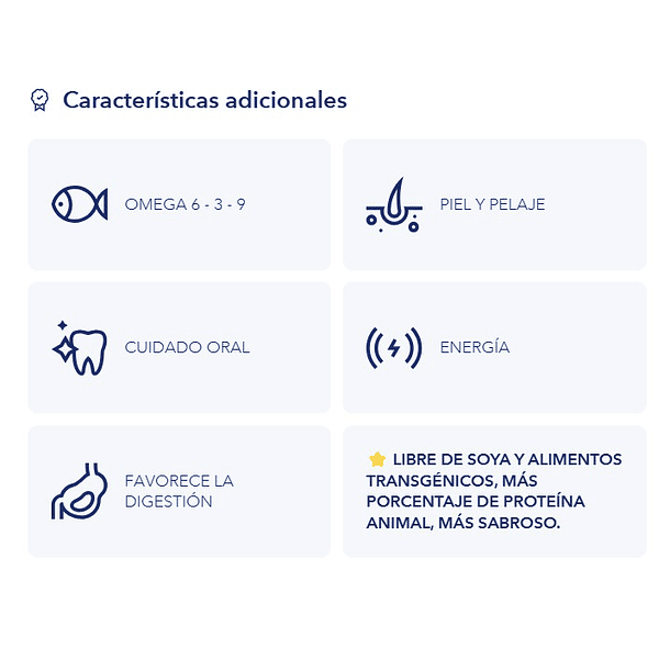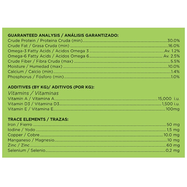 Ingredientes: Pollo deshidratado, cebada, salvado de trigo, grasa de pollo, cerdo deshidratado, trigo, linaza, hidrolizado de hígado, gluten de maíz, achicoria deshidratada, (fuente natural de FOS e inulina), minerales, aceite de salmón.